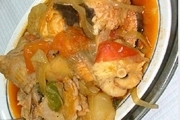 | Preparação: Cortar as cebolas às rodelas finas e pôr no fundo do tacho (ferro ou alumínio). Dispor por cima as batatas cortadas às rodelas, os pimentos em tiras e o tomate picado. Temperar com o azeite, o cravinho e pimenta q.b.