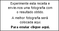 | EntradasEntradas e Aperitivos |  | SopasSopas, Caldos e Cremes |  | AcompanhamentosArroz, Batatas, Legumes,... | |  | MolhosMolhos e Temperos |  | SobremesasBolos, Doces, Gelados,... |  | VegetarianaEntradas, Pratos e Sobremesas | |  | Pães e PizzasMassas, Pães e Pizzas |  | MassasEsparguete, Lasanha... |  | PeixesAtum, Bacalhau, Lulas | |  | CarnesFrango, Vaca, Porco, Peru,... |  | BebidasBebidas e Cocktails |  | InternacionalBrasil, Angola, China | |  | SaladasFrias e Quentes |  | AveiroDistrito de Aveiro |  | MariscoCamarão, Lagosta, Sapateira,... |