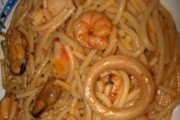 Cortar as lulas em tiras finas cozer o esparguete al dente, escorre-lo e mantê-lo quente aquecer 2 colheres de sopa de óleo e alourar o alho e a cebola, juntar o vinho, deixar ferver e juntar a tinta de lula juntar ao esparguete e envolver temperar com sal e pimenta fritar as lulas no óleo até estarem tenras e brancas servir as lulas sobre o esparguete.